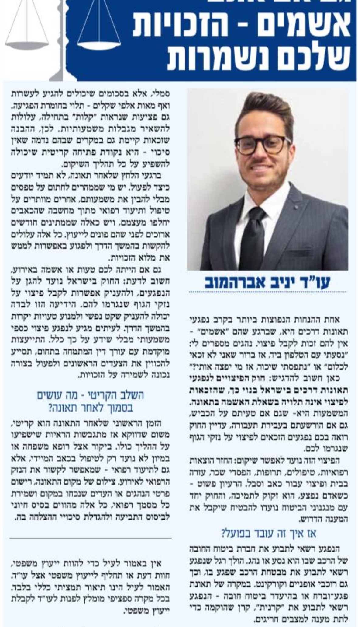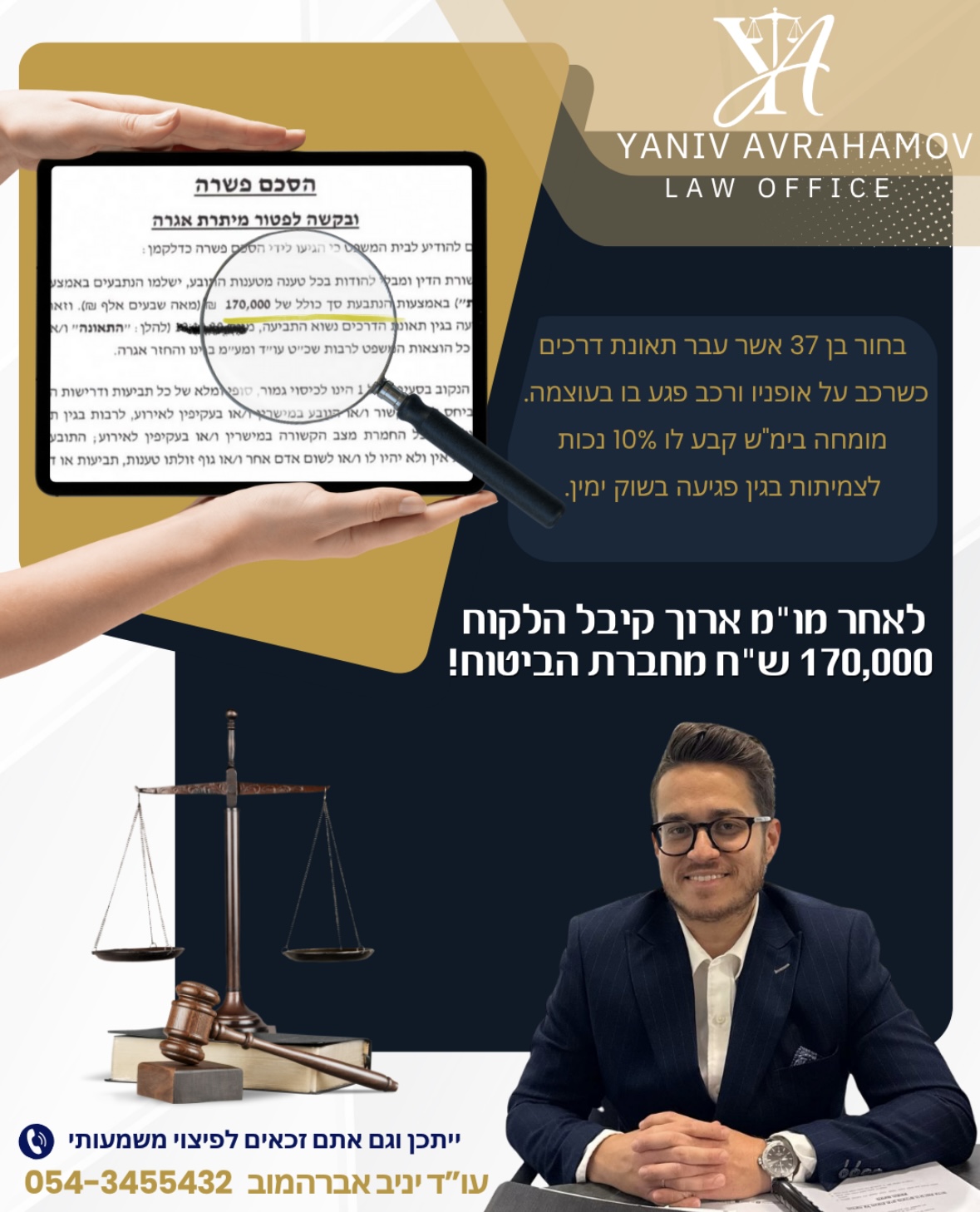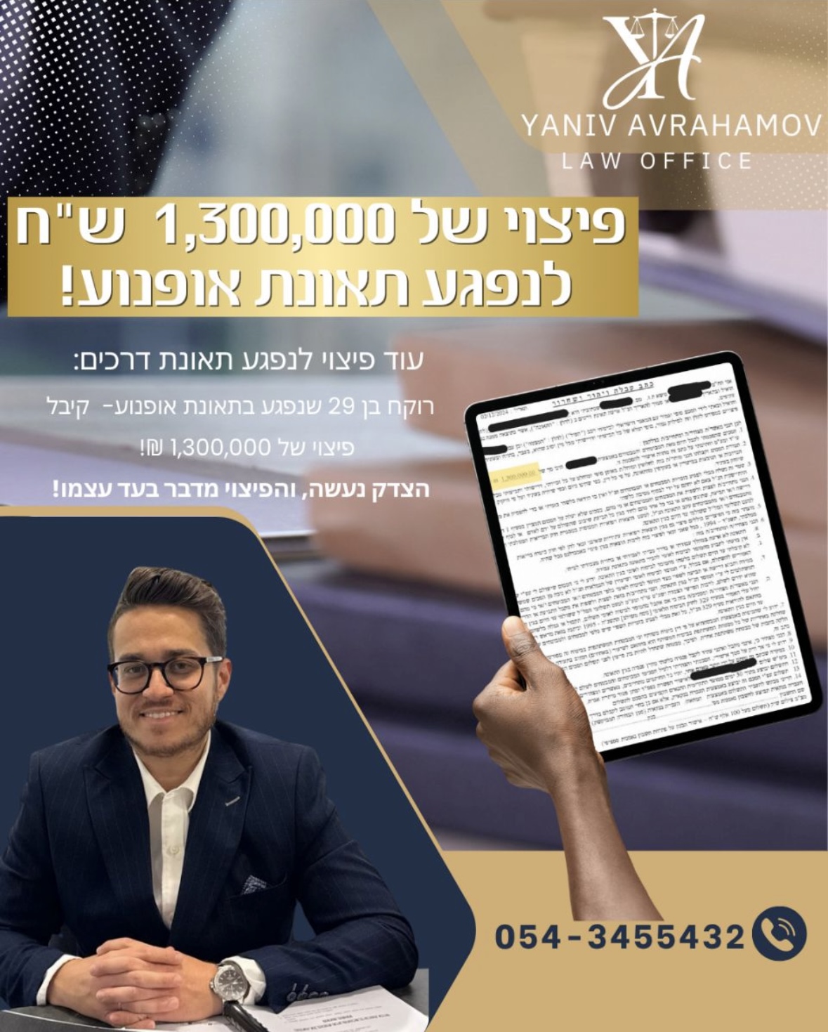 משרד עורכי דין יניב אברהמוב עוסק בתחום נזקי הגוף, לרבות תאונות דרכים, תאונות עבודה ותאונות שאירעו במרחב הציבורי.